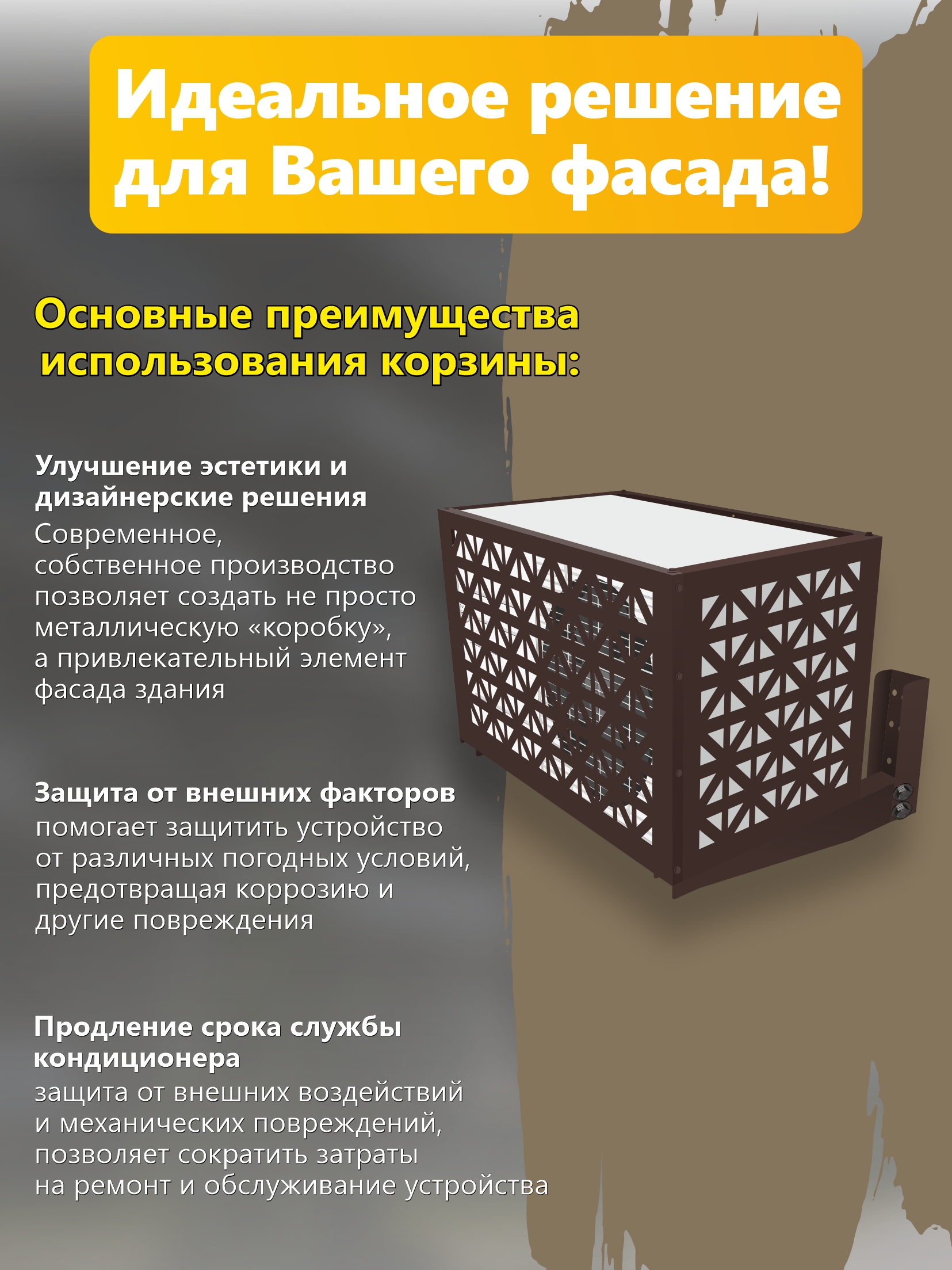 Компания Сигнал предлагает к продаже корзины для кондиционера в комплекте с кронштейном из двух частей, вы также можете выбрать другой вариант кронштейна на ваш выбор, в таком случае цена будет отличаться, уточняйте у менеджеров